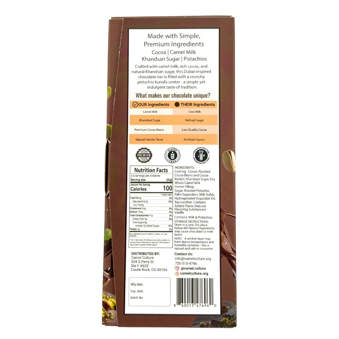 This indulgent camel milk chocolate bar blends silky cocoa, crunchy pistachio, and sweet kunafa-inspired filling into a rich Middle Eastern classic - crafted with real camel milk for a smooth, creamy finish you won’t find anywhere else.